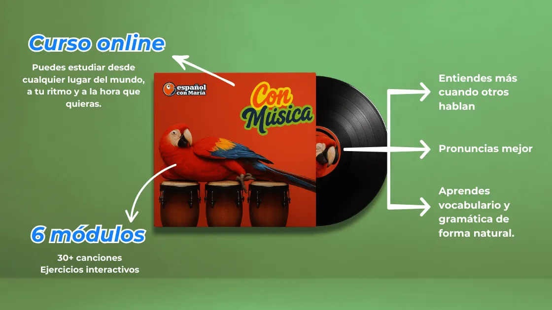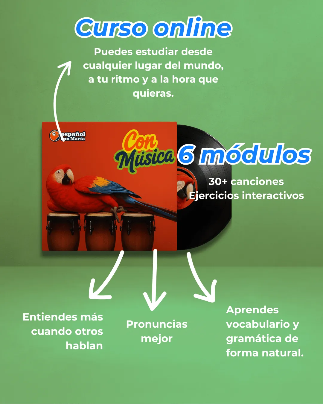 Además de ser divertido y efectivo, "Aprender español con música" es un curso 100% online que puedes seguir en el momento que quieras y las veces que quieras.
